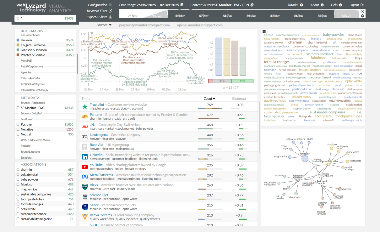 To showcase the capabilities of AI Visibility Tracking, we compared AI responses related to global consumer goods companies. The system issued high-frequency prompts to multiple generative engines, collecting brand-specific answers around the clock. This setup demonstrates that GEO analysis can achieve high temporal granularity for dynamic brand environments. With the webLyzard dashboard, users can then explore trends and patterns in AI responses through dedicated views that go far beyond simple statistics: